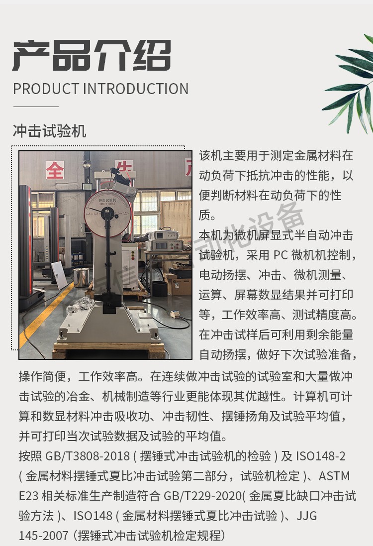 本機為微機屏顯式半自動沖擊試驗機,采用PC微機機控制,電動揚擺、沖擊、微機測量、運算、屏幕數(shù)顯結果并可打印等,工作效率高、測試精度高。在沖擊試樣后可利用剩余能量自動揚擺,做好下次試驗準備,操作簡便,工作效率高。在連續(xù)做沖擊試驗的試驗室和大量做沖擊試驗的冶金、機械制造等行業(yè)更能體現(xiàn)其優(yōu)越性。計算機可計算和數(shù)顯材料沖擊吸收功、沖擊韌性、擺錘揚角及試驗平均值,并可打印當次試驗數(shù)據(jù)及試驗的平均值。 按照 GB/T3808-2018 (擺錘式?jīng)_擊試驗機的檢驗)及 ISO148-2(金屬材料擺錘式夏比沖擊試驗第二部分,試驗機檢定)、ASTM E23 相關標準生產制造符合 GB/T229-2020(金屬夏比缺口沖擊試驗方法)、ISO148 (金屬材料擺錘式夏比沖擊試驗)、JJG 145-2007 (擺錘式?jīng)_擊試驗機檢定規(guī)程) 四、主要技術指標: 1、沖擊能量:150J、300J 2、擺錘預揚角:150° 3、擺軸中心至沖擊點距離:750mm 4、沖擊速度:5.2m/s 5、試樣支座跨距:40mm 6、鉗口圓角:R1-1.5mm 7、沖擊刀刃圓角:R2-2.5mm 8、沖擊刀厚度:16mm 9、角度準確度:±0.1° 10、試樣尺寸:10×10×55mm 11、外形尺寸:2124 mm×600 mm×1340 mm 12、試驗機凈重:450Kg 13、電源:交流三相 380V±10% 50HZ 5A 14、環(huán)境條件:周圍環(huán)境中無腐蝕介質,無震動,無強電磁場干擾。 五、設備主要配置: 1、300焦耳主機一臺; 2、150J、300J 擺錘各一個 3、取擺傳動裝置一套(裝在主機上) 4、自動掛擺裝置一套(裝在主機上) 5、保險機構一套(裝在主機上) 6、安全防護裝置一套 7、擺錘拆卸器一只 8、支座調校器一只 9、試樣對中器一只 10、聯(lián)想打印機一套 專用測量軟件一套