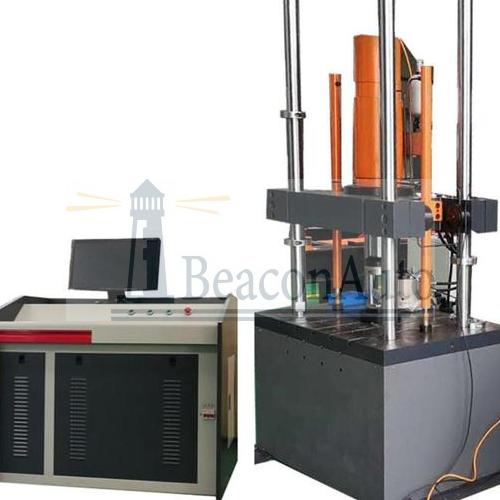 鐵路墊板動態(tài)試驗機 軌道墊板疲勞 軌枕 橡膠節(jié)點 鐵路墊板用于鋼軌和混凝土軌枕之間,它的主要作用是緩沖車輛通過路軌時所產(chǎn)生的高速振動和沖擊,保護路基和軌枕,并對信號系統(tǒng)進行電絕緣.鐵路墊板動態(tài)試驗機 軌道墊板疲勞 軌枕 橡膠節(jié)點試驗機廣泛應用于材料和零部件的動、靜態(tài)力學性能試驗,包括材料和零部件的拉伸、壓縮、低周和高周疲勞等試驗。本試驗機可以滿足TB/T3396.1-2015《高速鐵路扣件》中要求的附錄A、B、C所規(guī)范的各種實驗方法。 結(jié)構(gòu)特征與工作原理:該機由主機、泵站、冷水機以及控制系統(tǒng)等幾部分組成。主機由底座、立柱、移動橫梁、作動器、抱緊缸以及升降油缸組成。四立柱安裝在工作臺上面。移動橫梁貫穿在四立柱上,橫梁貫穿孔外側(cè)開有鎖緊口,正面安裝有鎖緊油缸。兩升降油缸固定在移動橫梁上面對角穿過中線,活塞桿向下伸出反向托舉橫梁移動,橫梁通過升降油缸可沿立柱上下移動,完成空間調(diào)整。作動器安裝在移動橫梁上面中心位置,活塞桿自橫梁中心孔向下伸出,并與試驗上輔具連接。負荷傳感器安裝在活塞桿上面和作動器中心位置對中,下面工作臺部分為放置輔具和測量變形的傳感器。 鐵路墊板動態(tài)試驗機 軌道墊板疲勞 軌枕 橡膠節(jié)點技術(shù)規(guī)格: 1、大靜態(tài)試驗力:±250kN,靜態(tài)示值精度:全程不分檔 ±0.5%; 2、大動態(tài)試驗力:±250kN;動態(tài)波動度:不大于±1%。 3、作動器大振幅:±75mm,示值精度±0.5%。 4、頻率范圍:0.01—50Hz ,長時工作頻率0.01~50Hz。 5、位移測量精度:±0.5%示值 (全程不分檔) 6、位移測量分辨率(磁致伸縮位移傳感器):0.01mm 7、軌道墊板疲勞試驗機由主機、泵站、冷水機以及控制系統(tǒng)等幾部分組成。主機由底座、立柱、移動橫梁、作動器、抱緊缸以及升降油缸組成。四立柱安裝在工作臺上面。移動橫梁貫穿在四立柱上,橫梁貫穿孔外側(cè)開有鎖緊口,正面安裝有鎖緊油缸。兩升降油缸固定在移動橫梁上面對角穿過中線,活塞桿向下伸出反向托舉橫梁移動,橫梁通過升降油缸可沿立柱上下移動,完成空間調(diào)整。作動器安裝在移動橫梁上面中心位置,活塞桿自橫梁中心孔向下伸出,并與試驗上輔具連接。負荷傳感器安裝在活塞桿上面和作動器中心位置對中,下面工作臺部分為放置輔具和測量變形的傳感器。 標簽:鐵路墊板動態(tài)試驗機 軌道墊板疲勞 軌枕 橡膠節(jié)點
