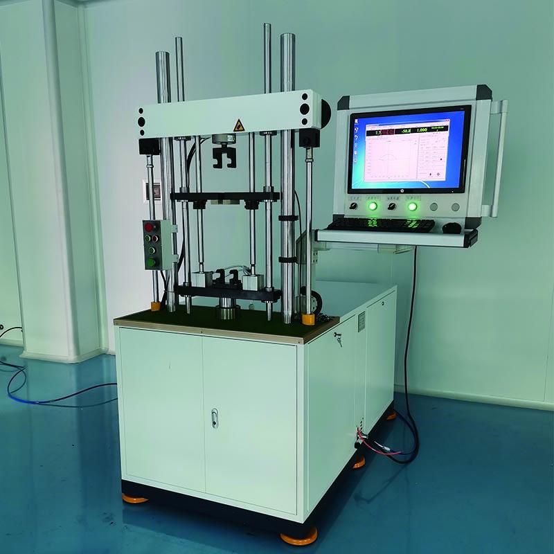 減震器阻尼力檢測(cè)系統(tǒng)產(chǎn)品概述:WPW-30A 微機(jī)控制減震器示功疲勞綜合試驗(yàn)臺(tái)主要用于對(duì)各種汽車、空氣懸掛氣囊減震 器、改裝車、SUV、裝甲車、輕卡、重卡、沙灘車等減震器及各種汽車等機(jī)動(dòng)車所使用的減振 器進(jìn)行示功試驗(yàn)、線速度試驗(yàn)、疲勞壽命試驗(yàn)等。也可制作特種夾具,以適應(yīng)特殊試樣的疲勞 試驗(yàn)。 減震器阻尼力檢測(cè)系統(tǒng)設(shè)備結(jié)構(gòu)的描述 該機(jī)為單工位操作,整體為立式雙柱式結(jié)構(gòu),由機(jī)座、上橫梁及升降機(jī)構(gòu)、阻尼力檢測(cè) 系統(tǒng)、驅(qū)動(dòng)機(jī)構(gòu)、減振器缸筒壓緊機(jī)構(gòu)、示功及疲勞工裝、液壓系統(tǒng)、采集卡、計(jì)算機(jī)、工 控軟件及電控系統(tǒng)、快插接頭可選等組成。 1、機(jī)座:采用工業(yè)級(jí)槽鋼和鋼板焊機(jī)而成長(zhǎng)方形框架,焊道均勻美觀。具備足夠的強(qiáng)度及剛 度,為了保證操作安全。 2、上橫梁及升降機(jī)構(gòu):由橫梁、兩橫梁導(dǎo)向立柱、兩升降液壓缸、橫梁鎖緊機(jī)構(gòu)、液壓等組 成。液壓缸驅(qū)動(dòng)橫梁上下移動(dòng)并在停位位置液壓自動(dòng)鎖緊,從而控制設(shè)備的安裝高度,使測(cè) 試行程位于減振器行程中段。 3、活塞桿頂緊及回拉機(jī)構(gòu):由液壓缸、導(dǎo)向及連接機(jī)構(gòu)、力傳感器及夾具等組成,實(shí)現(xiàn)活塞 桿夾緊后回拉到工作位置。 4、阻尼力檢測(cè)系統(tǒng):由力傳感器和手動(dòng)裝夾裝置等組成。力傳感器用于對(duì)工件運(yùn)動(dòng)過程中的 拉伸及壓縮力值進(jìn)行實(shí)時(shí)監(jiān)測(cè)。 5、驅(qū)動(dòng)機(jī)構(gòu):由伺服電機(jī)、減速機(jī)、齒形帶、齒形帶輪、軸承座、主軸、曲柄、滑塊及導(dǎo)向 裝置等組成。電機(jī)減速機(jī)為運(yùn)動(dòng)部分提供動(dòng)力。通過齒形帶和主軸的傳動(dòng),將動(dòng)力傳遞到曲 柄滑塊機(jī)構(gòu),用以實(shí)現(xiàn)帶動(dòng)工件按正弦運(yùn)動(dòng)。 6、減振器缸筒壓緊機(jī)構(gòu):由位移傳感器、壓緊油缸、上壓緊板、導(dǎo)柱、底座等組成。由油缸 驅(qū)動(dòng)上壓板上下滑動(dòng),實(shí)現(xiàn)對(duì)減振器缸筒的壓緊。通過位移傳感器監(jiān)控導(dǎo)向器壓裝行程是否 到位。 7、示功工裝:由減振器吊環(huán)快速夾緊工裝及減振器缸筒壓緊工裝組成,工裝采用快換結(jié)構(gòu)。 上吊環(huán)采用通用結(jié)構(gòu),手工放入后,采用機(jī)械式加緊兩種。 8、液壓系統(tǒng):由油箱、單向閥、換向閥、調(diào)壓閥、電機(jī)、油泵、空氣濾請(qǐng)器等組成,為工件 夾緊及上橫梁升降提供動(dòng)力。液壓系統(tǒng)的導(dǎo)向器頂緊油缸及吊環(huán)頂緊油缸的油路分別加調(diào)壓 閥、壓力表來控制及顯示油路壓力。 9、采集卡:用于力及位移信號(hào)的采集與轉(zhuǎn)化。 10、計(jì)算機(jī)(采用 XP 系統(tǒng)):用于對(duì)采集卡采集信號(hào)的接收,并通過安裝的工控軟件進(jìn)行運(yùn)算、 分析、繪制 P-S 圖和 P-V 圖,顯示最大拉伸及壓縮阻尼力,設(shè)置、上下限,不合格屏顯報(bào)警 并加裝紅綠燈顯示。 11、電氣控制系統(tǒng):由伺服電機(jī)驅(qū)動(dòng)器、電氣元件、電氣回路及電控箱等組.成。設(shè)有手動(dòng)及自動(dòng)兩種操作模式,設(shè)備增加原點(diǎn)開關(guān),保證一鍵復(fù)位。 減震器阻尼力檢測(cè)系統(tǒng)功能和特點(diǎn): 1) 系統(tǒng)設(shè)置保存功能:測(cè)試系統(tǒng)可對(duì)力和速度的設(shè)置進(jìn)行保存; 2) 自檢功能:可對(duì)設(shè)備自檢,查看設(shè)備是否正常; 3) 運(yùn)行調(diào)整功能:將位移傳感器殼體上移或下移,對(duì)位移傳感器校零; 4) 傳感器標(biāo)定功能:可對(duì)力傳感器、位移傳感器和速度進(jìn)行標(biāo)定。 5) 力傳感器清零功能:力傳感器下端安裝夾具更換時(shí),且每天第一次試驗(yàn)區(qū)前都需要力傳 感器清零; 6) 單工況測(cè)試功能:可對(duì)減振器進(jìn)行單工況測(cè)試,可手動(dòng)測(cè)試也可自動(dòng)測(cè)試,實(shí)驗(yàn)完成后, 可將實(shí)驗(yàn)數(shù)據(jù)保存、讀取和打印。 7) 多工況測(cè)試功能:可對(duì)減振器進(jìn)行多工況測(cè)試,可手動(dòng)測(cè)試也可自動(dòng)測(cè)試,實(shí)驗(yàn)完成后, 可將實(shí)驗(yàn)數(shù)據(jù)保存、讀取和打印。 8) 計(jì)數(shù)功能:可對(duì)每 24 小時(shí)所試驗(yàn)的減振器數(shù)量(包括合格品數(shù)量和不合格品數(shù)量),并 可保存、讀取、打印。 9) 示功結(jié)果可生成報(bào)告(包括數(shù)據(jù)、圖形),數(shù)據(jù)以 Excle 文件存儲(chǔ)。 10) 疲勞試驗(yàn)(可以根據(jù)實(shí)驗(yàn)要求,做破壞性試驗(yàn)。能達(dá)到預(yù)設(shè)次數(shù)停機(jī)功能、力值衰減曲 線、峰值檢測(cè)等) 11) 電感測(cè)試:在同一速度要求下,可以給定不同的電流或電壓來測(cè)試復(fù)原和壓縮阻力. 減震器阻尼力檢測(cè)系統(tǒng)設(shè)備的技術(shù)參數(shù): 1、最大力值:30000N 2、速度:可在 0.01~0.52m/s 之間可調(diào),電機(jī)為伺服電機(jī),精度更高,通過控制器可隨意設(shè)置 所需的速度,也可設(shè)置快捷件,達(dá)到常用速度的使用便捷性。 3、行程:0~100mm(