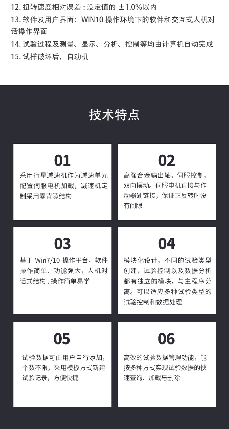 軟件部分: ?基于Win7/10操作平臺(tái),軟件操作簡(jiǎn)單、功能強(qiáng)大,人機(jī)對(duì)話(huà)式結(jié)構(gòu)。操作簡(jiǎn)單易學(xué) ?軟件采用模塊化設(shè)計(jì),不同的試驗(yàn)類(lèi)型創(chuàng)建,試驗(yàn)控制以及數(shù)據(jù)分析都有獨(dú)立的模塊,與主程序分離??梢赃m應(yīng)多種試驗(yàn)類(lèi)型的試驗(yàn)控制和數(shù)據(jù)處理 ?試驗(yàn)數(shù)據(jù)可由用戶(hù)自行添加,個(gè)數(shù)不限,采用模板方式新建試驗(yàn)記錄,方便快捷 ?自動(dòng)完成試驗(yàn)過(guò)程、判斷破型,自動(dòng)記錄保存試驗(yàn)數(shù)據(jù)。所有試驗(yàn)數(shù)據(jù)以國(guó)際通用的XML格式保存 ?高效的試驗(yàn)數(shù)據(jù)管理功能,能按多種方式實(shí)現(xiàn)試驗(yàn)數(shù)據(jù)的快速查詢(xún)、加載與刪除 ?試驗(yàn)結(jié)束系統(tǒng)自動(dòng)分析、統(tǒng)計(jì)試驗(yàn)結(jié)果,分析方式可由用戶(hù)自行設(shè)定 ?靈活的報(bào)表編輯功能,為用戶(hù)提供了面向圖形排版的專(zhuān)用報(bào)表編輯工具,簡(jiǎn)單易學(xué),能方便的打印試驗(yàn)曲線(xiàn)及相關(guān)圖片、文字 ?用戶(hù)可根據(jù)需要對(duì)試驗(yàn)數(shù)據(jù)進(jìn)行刪除 ?用戶(hù)可以根據(jù)需要改變分析方法,數(shù)據(jù)可以根據(jù)本身需要自行修改修約方式 ?專(zhuān)用的數(shù)據(jù)庫(kù)管理庫(kù)模塊 ?分四檔數(shù)碼顯示試驗(yàn)力值,精度為每檔量程20%開(kāi)始示值的±1% ?分四檔數(shù)碼顯示變形,精度為每檔量程20%開(kāi)始±0.5% ?同時(shí)記錄扭矩-時(shí)間,扭角-時(shí)間、扭矩-扭角、扭矩-轉(zhuǎn)角試驗(yàn)曲線(xiàn),可隨時(shí)切換觀察,任意放大縮小,水平或垂直移動(dòng),實(shí)時(shí)高速采樣 ?采用人機(jī)交互方式分析計(jì)算測(cè)試材料的機(jī)械性能指標(biāo),試驗(yàn)結(jié)束時(shí)系統(tǒng)會(huì)自動(dòng)計(jì)算最大扭矩、抗扭強(qiáng)度、上下屈服扭矩、規(guī)定非比例扭矩、切變模量等,在自動(dòng)分析的基礎(chǔ)上,還可以人工干預(yù)修正分析結(jié)果,提高分析的準(zhǔn)確性