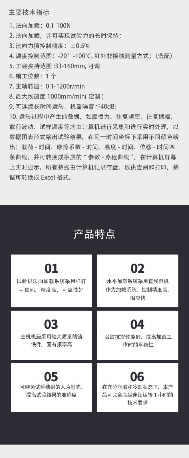 試驗(yàn)機(jī)結(jié)構(gòu)原理 1.主要技術(shù)要求及滿足情況:(水平運(yùn)動(dòng)總成選配) 為滿足2的各項(xiàng)技術(shù)要求,本產(chǎn)品擬采用以下方案 3.1該試驗(yàn)機(jī)由法向加載系統(tǒng)、水平杠桿,扭矩測(cè)力系統(tǒng),溫控系統(tǒng),其冷卻及潤滑裝置、電氣控制柜及計(jì)算機(jī)實(shí)時(shí)數(shù)據(jù)采集及控制系統(tǒng)(包括軟件)等部分組成; 試驗(yàn)機(jī)主機(jī)主要由主機(jī)機(jī)座、水平機(jī)座、法向主軸及其驅(qū)動(dòng)系統(tǒng)、試驗(yàn)力施加裝置、摩擦扭矩及位移高精度傳感測(cè)量系統(tǒng)、試驗(yàn)力測(cè)量及摩擦溫度測(cè)量系統(tǒng)等組成;試驗(yàn)機(jī)法向加載系統(tǒng)采用杠桿+砝碼,精度高,可靠性好;水平加載系統(tǒng)采用直線電機(jī)作為加載系統(tǒng),控制精度高,相應(yīng)快,主機(jī)機(jī)座采用較大質(zhì)量的鑄鐵件,固有頻率高,吸震抗震性能好,箱體座也是采用鐵件經(jīng)數(shù)控鏜加工后將電主軸牢固鎖緊在箱體座中,這樣可以提高加載工作時(shí)的平穩(wěn)性。 3.2冷卻及潤滑裝置的功能主要是對(duì)作動(dòng)器進(jìn)行冷卻和潤滑,以使作動(dòng)器長時(shí)穩(wěn)定可靠工作。(適用于油品測(cè)試) 3.3計(jì)算機(jī)實(shí)時(shí)數(shù)據(jù)采集及數(shù)據(jù)處理控制系統(tǒng)是專門編制的控制軟件對(duì)各項(xiàng)試驗(yàn)參數(shù)進(jìn)行人為設(shè)定、采集、監(jiān)控及輸出的智能系統(tǒng),可避免試驗(yàn)結(jié)果的人為影響,提高試驗(yàn)結(jié)果的準(zhǔn)確度。 3.5摩擦力的測(cè)量選用美國世銓公司的高精度力傳感器; 3.6在充分潤滑和冷卻狀態(tài)下,本產(chǎn)品可完全滿足連續(xù)運(yùn)轉(zhuǎn)1小時(shí)的技術(shù)要求。 3.7本產(chǎn)品可進(jìn)行“銷-盤”、“環(huán)-盤”“環(huán)-塊”等多種摩擦副的試驗(yàn),并可在干摩擦及有油潤滑狀態(tài)下工作;摩擦副形式及尺寸可按用戶要求設(shè)計(jì),易于操作,裝卸試樣方便,并附專用工具等。 3.8試驗(yàn)溫度的測(cè)量采用中科院產(chǎn)紅外非接觸測(cè)溫方式進(jìn)行。 3.9根據(jù)技術(shù)要求,通過智能儀表及專門編制的計(jì)算機(jī)軟件對(duì)試驗(yàn)運(yùn)轉(zhuǎn)過程中產(chǎn)生的諸如摩擦力矩、載荷波動(dòng)、摩擦溫升等試驗(yàn)參數(shù)進(jìn)行實(shí)時(shí)采集及處理,并給出相應(yīng)的試驗(yàn)曲線,可將試驗(yàn)數(shù)據(jù)存盤并轉(zhuǎn)換成Excel表格形式以供查閱和打印輸出。