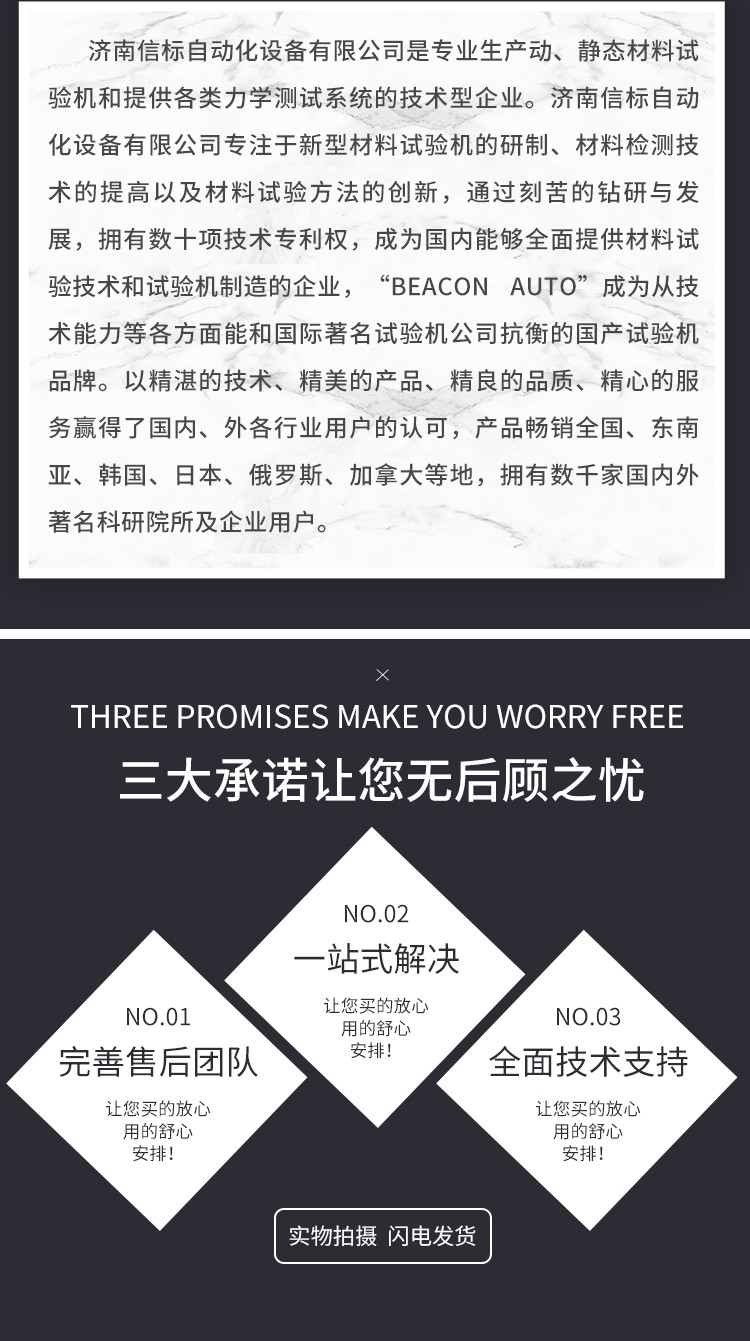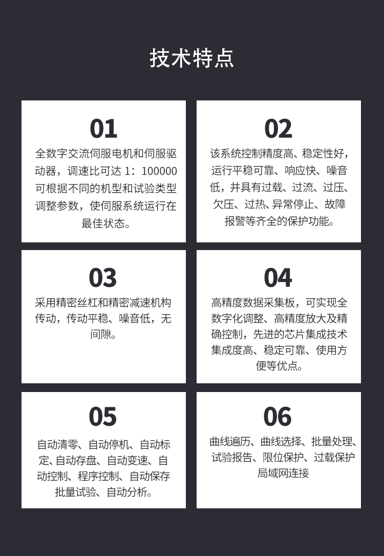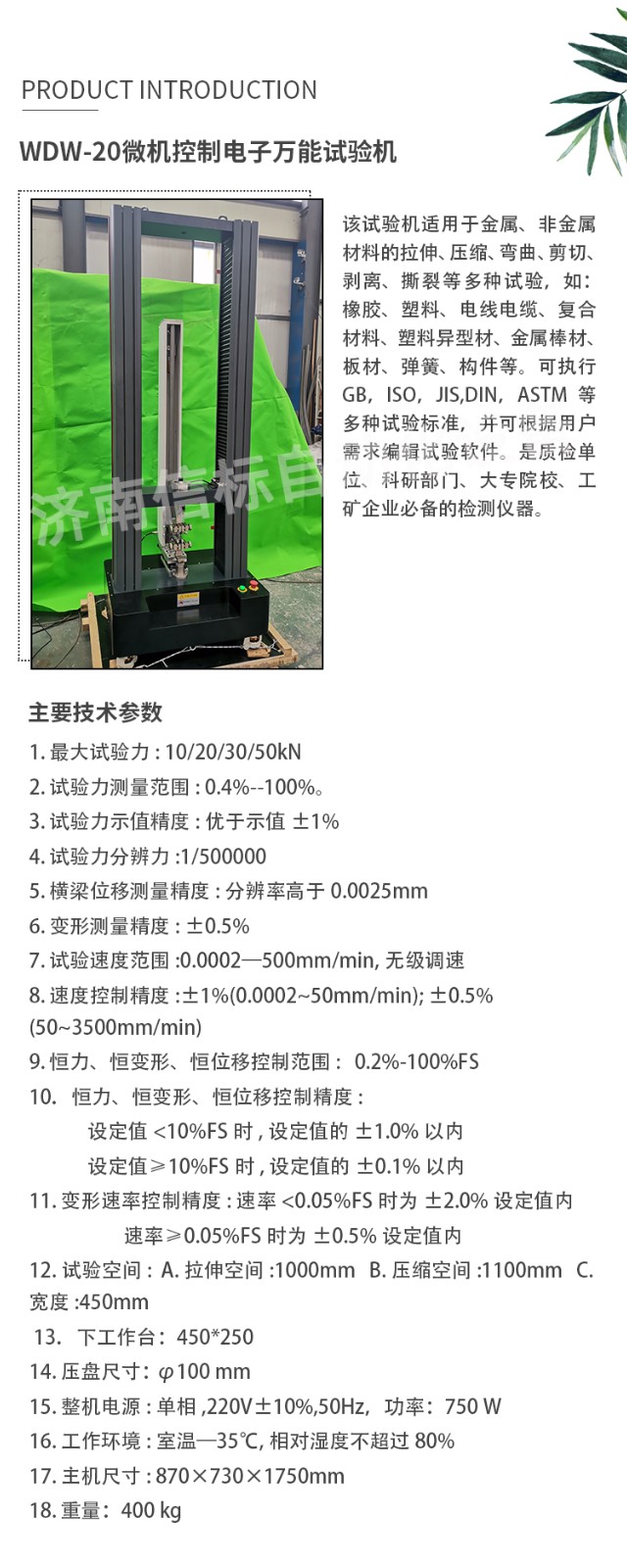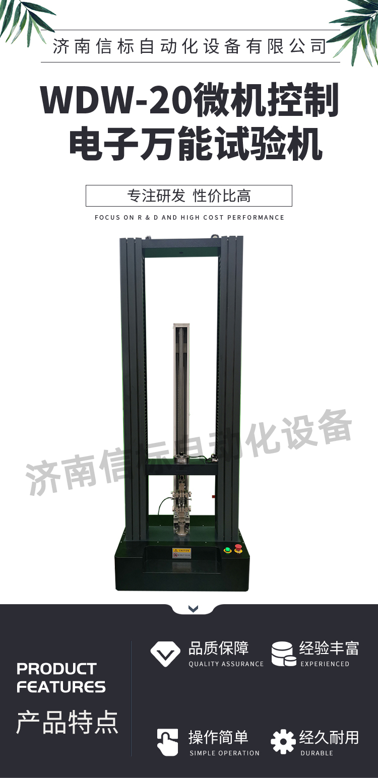 測(cè)量參數(shù): 1. 最大試驗(yàn)力: 10/20/30/50kN 2. 試驗(yàn)力測(cè)量范圍: 0.4%--100%。 3. 試驗(yàn)力示值精度:優(yōu)于示值±1% 4. 試驗(yàn)力分辨力:1/500000 5. 橫梁位移測(cè)量精度:分辨率高于0.0025mm 6. 變形測(cè)量精度: ±0.5% 7. 試驗(yàn)速度范圍:0.0002—500mm/min,無(wú)級(jí)調(diào)速 8. 速度控制精度:±1%(0.0002~50mm/min); ±0.5%(50~3500mm/min) 9. 恒力、恒變形、恒位移控制范圍: 0.2%-100%FS 10.恒力、恒變形、恒位移控制精度: 設(shè)定值<10%FS時(shí),設(shè)定值的±1.0%以內(nèi) 設(shè)定值≥10%FS時(shí),設(shè)定值的±0.1%以內(nèi) 11. 變形速率控制精度: 速率<0.05%FS時(shí)為±2.0%設(shè)定值內(nèi) 速率≥0.05%FS時(shí)為±0.5%設(shè)定值內(nèi) 12. 試驗(yàn)空間: A.拉伸空間:1000mm B.壓縮空間:1100mm C.寬度:450mm 13.下工作臺(tái):450*250 14. 壓盤尺寸:φ100 mm 15. 整機(jī)電源:單相,220V±10%,50Hz,功率:750 W 16. 工作環(huán)境:室溫—35℃,相對(duì)濕度不超過(guò)80% 17. 主機(jī)尺寸: 870×730×1750mm 18. 重量:400 kg 三、產(chǎn)品配置: 1、主機(jī) 一套 2、松下A7全數(shù)字伺服電機(jī)及伺服驅(qū)動(dòng)器; 一套 3、高精度負(fù)荷傳感器; 5kn/1kn/500N/200/ 各一支 4、Hiwin精密滾珠絲杠; 2支 5、光電編碼器(2500線,內(nèi)置); 1支 6、夾具:滿足海綿/汽車座椅所需工裝 1套(有多種) 7、三閉環(huán)測(cè)量系統(tǒng)一套,采用力,位移,應(yīng)變等多種控制方式,試驗(yàn)過(guò)程中可實(shí)時(shí)顯示力-位移,力-時(shí)間,應(yīng)力-應(yīng)變等多種試驗(yàn)曲線,并可自動(dòng)得出最大負(fù)荷,拉伸強(qiáng)度,斷裂伸長(zhǎng)率等多種結(jié)果參數(shù)。 8、HP品牌計(jì)算機(jī),21寸液晶顯示器; 9、打印機(jī):HPA4彩色噴墨打印機(jī); 10、專用試驗(yàn)軟件:可執(zhí)行GB,ISO,JIS、DIN,ASTM等多種試驗(yàn)標(biāo)準(zhǔn),全開(kāi)放式,功能強(qiáng)大,方便操作,免費(fèi)提供升級(jí)軟件,并可根據(jù)用戶需求自行編輯試驗(yàn)軟件。