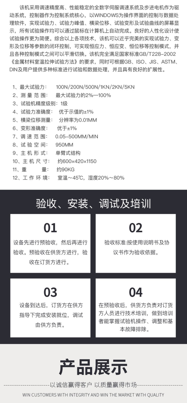 飯盒壓縮抗壓試驗機 單臂壓力萬能試驗機主要技術指標: 1、 最大試驗力: 100N/200N/500N/1KN/2KN/5KN 2、 測 量 范 圍: 最大試驗力的2%—100% 3、 試驗機精度級別:1級 4、 試驗力準確度: 優(yōu)于示值的±1% 5、 橫梁位移測量: 分辨率為0.01mm 6、 變形準確度: 優(yōu)于±1% 7、 調(diào) 速 范 圍: 0.05-500mm/min 8、 試 驗 空 間: 950mm 9、 主 機 形 式: 單臂式結(jié)構(gòu) 10、 主 機 尺 寸: 約600×420×1150 11、 重 量: 約90Kg 12、 工 作 環(huán) 境: 室溫~45℃,濕度20%~80% 飯盒壓縮抗壓試驗機 單臂壓力萬能試驗機主要功能及特點: 主機: 1.1調(diào)速系統(tǒng)采用伺服電機和自主研發(fā)減速系統(tǒng),性能穩(wěn)定可靠,具有過流、過壓、過載等保護裝置。調(diào)速范圍可達0.05~500mm/min。 1.2傳動部分采用圓弧同步齒形帶,精密絲杠副傳動,傳動平穩(wěn),噪音低,傳動效率高。 1.3萬向節(jié)采用十字插銷結(jié)構(gòu),而且具有擺角限制功能,一方面便于試樣夾持,保證試驗同心度,另一方面很好的消除了不規(guī)則試樣對傳感器的影響。 2、控制系統(tǒng)、操作軟件及數(shù)據(jù)處理系統(tǒng) 2.1計算機控制系統(tǒng),具有集成度高、性能穩(wěn)定、調(diào)整方便等優(yōu)點??梢詫嶒灁?shù)據(jù)進行實時采集,對實驗特性曲線實現(xiàn)實時動態(tài)顯示,試驗數(shù)據(jù)文件能以Access常用數(shù)據(jù)庫或SQLserve大型數(shù)據(jù)庫的方式保存,方便實現(xiàn)客戶的資源共享及網(wǎng)絡管理,以及用戶的再分析。對于用戶自定義的各種word2000報表,該軟件可輕松實現(xiàn)訪問,解決了不同用戶或同一用戶在不同時期對試驗報表有不同需要的難題。該軟件可處理試驗力、位移、 時間、變形的原始數(shù)據(jù)及由此派生的曲線。