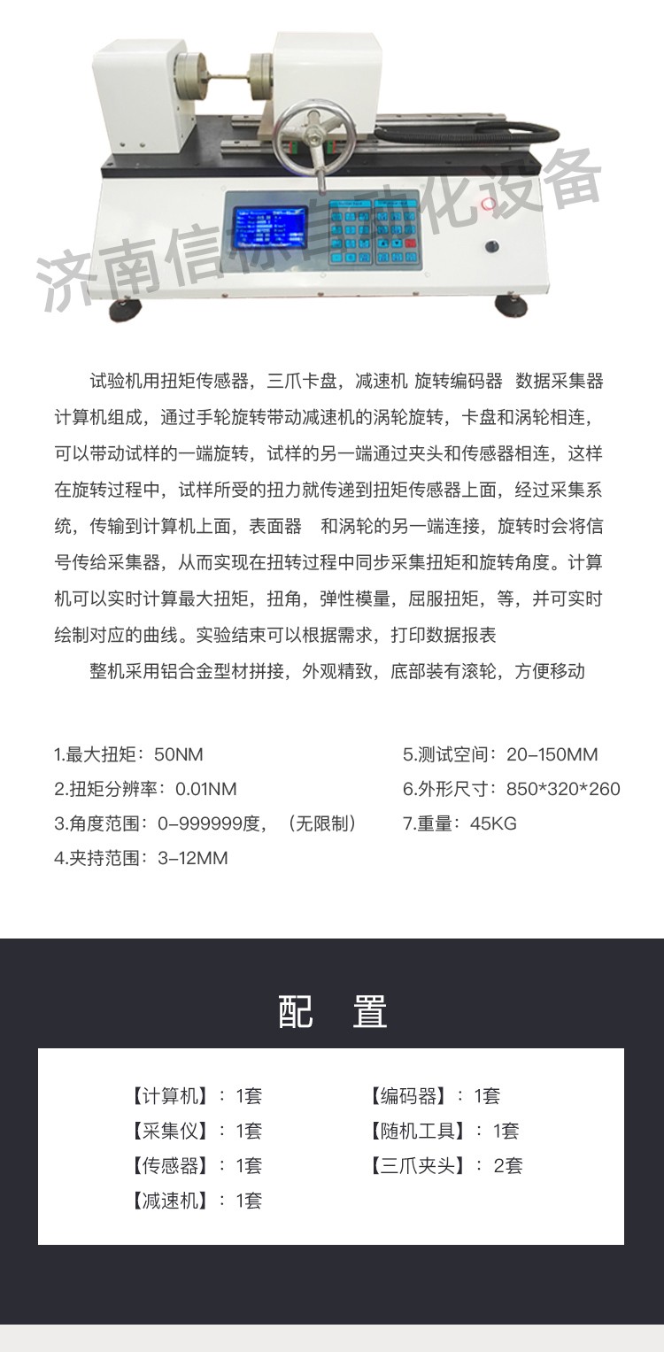 一、介紹 試驗(yàn)機(jī)用扭矩傳感器,三爪卡盤,減速機(jī) 旋轉(zhuǎn)編碼器 數(shù)據(jù)采集器 計(jì)算機(jī)組成,通過手輪旋轉(zhuǎn)帶動(dòng)減速機(jī)的渦輪旋轉(zhuǎn),卡盤和渦輪相連,可以帶動(dòng)試樣的一端旋轉(zhuǎn),試樣的另一端通過夾頭和傳感器相連,這樣在旋轉(zhuǎn)過程中,試樣所受的扭力就傳遞到扭矩傳感器上面,經(jīng)過采集系統(tǒng),傳輸?shù)接?jì)算機(jī)上面,表面器 和渦輪的另一端連接,旋轉(zhuǎn)時(shí)會(huì)將信號(hào)傳給采集器,從而實(shí)現(xiàn)在扭轉(zhuǎn)過程中同步采集扭矩和旋轉(zhuǎn)角度。計(jì)算機(jī)可以實(shí)時(shí)計(jì)算最大扭矩,扭角,彈性模量,屈服扭矩等,并可實(shí)時(shí)繪制對(duì)應(yīng)的曲線。實(shí)驗(yàn)結(jié)束可以根據(jù)需求,打印數(shù)據(jù)報(bào)表,整機(jī)采用鋁合金型材拼接,外觀精致,底部裝有滾輪,方便移動(dòng)。試驗(yàn)機(jī)用扭矩傳感器,三爪卡盤,減速機(jī) 旋轉(zhuǎn)編碼器 數(shù)據(jù)采集器 計(jì)算機(jī)組成,通過手輪旋轉(zhuǎn)帶動(dòng)減速機(jī)的渦輪旋轉(zhuǎn),卡盤和渦輪相連,可以帶動(dòng)試樣的一端旋轉(zhuǎn),試樣的另一端通過夾頭和傳感器相連,這樣在旋轉(zhuǎn)過程中,試樣所受的扭力就傳遞到扭矩傳感器上面,經(jīng)過采集系統(tǒng)。 二、基本參數(shù) 1.最大扭矩:50NM 2.扭矩分辨率:0.01NM 3.角度范圍:0-999999度,(無限制) 4.夾持范圍:3-12mm 5.測試空間:20-150mm 6.外形尺寸:850*320*260 7.重量:45kg 三配置: 1.計(jì)算機(jī):1套 2.采集儀:1套 3.傳感器:1套 4.減速機(jī):1套 5.編碼器:1套 6.隨機(jī)工具:1套 7.三爪夾頭:2套