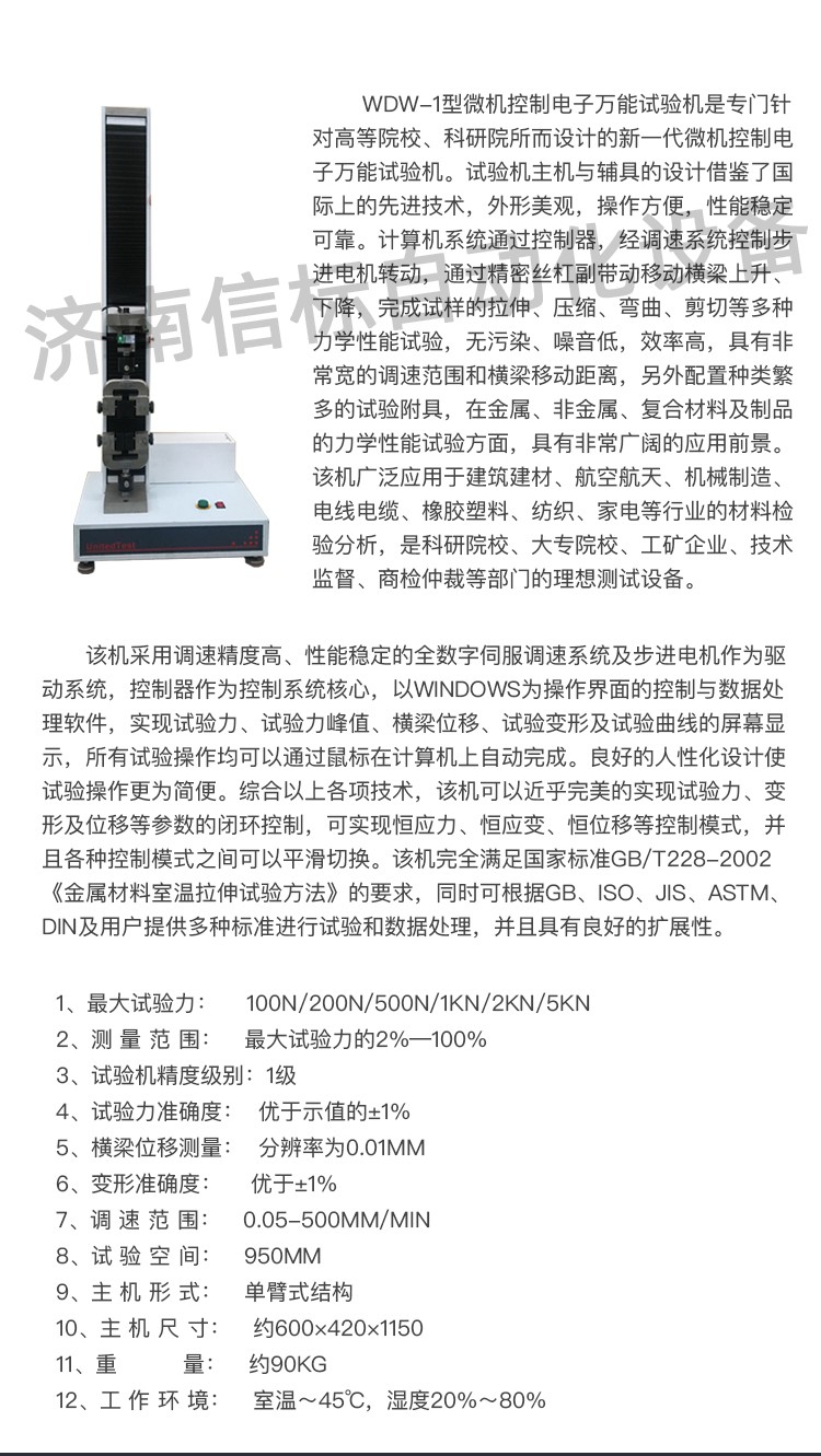 金屬材料壓縮彎曲實(shí)驗(yàn)口罩塑料拉伸強(qiáng)度試驗(yàn)機(jī)主要技術(shù)指標(biāo): 1、最大試驗(yàn)力: 100N/200N/500N/1KN/2KN/5KN 2、測(cè) 量 范 圍: 最大試驗(yàn)力的2%—100% 3、試驗(yàn)機(jī)精度級(jí)別:1級(jí) 4、試驗(yàn)力準(zhǔn)確度: 優(yōu)于示值的±1% 5、橫梁位移測(cè)量: 分辨率為0.01mm 6、變形準(zhǔn)確度: 優(yōu)于±1% 7、調(diào) 速 范 圍: 0.05-500mm/min 8、試 驗(yàn) 空 間: 950mm 9、主 機(jī) 形 式: 單臂式結(jié)構(gòu) 10、主 機(jī) 尺 寸: 約600×420×1150 11、重 量: 約90Kg 12、工 作 環(huán) 境: 室溫~45℃,濕度20%~80%