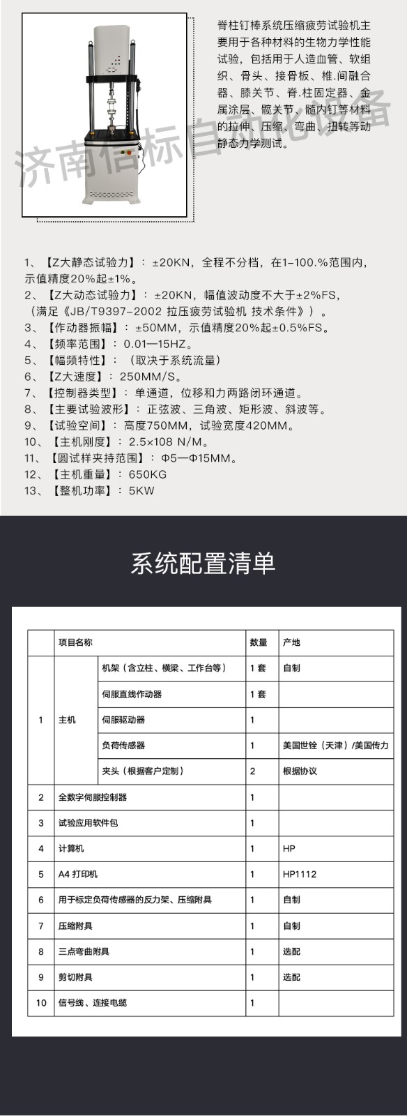 濟(jì)南信標(biāo)自動(dòng)化設(shè)備有限公司主要生產(chǎn):動(dòng)靜態(tài)萬(wàn)能疲勞試驗(yàn)機(jī),接骨板彎曲試驗(yàn)機(jī),縫合線拉伸疲勞試驗(yàn)機(jī),髖膝關(guān)節(jié)磨損試驗(yàn)機(jī),電子萬(wàn)能試驗(yàn)機(jī)、液壓萬(wàn)能試驗(yàn)機(jī)、巖石三軸、四軸,電液拉力試驗(yàn)機(jī),材料試驗(yàn)機(jī),高低溫蠕變,高低頻疲勞,拉伸、扭轉(zhuǎn)、杯突等二十多個(gè)系列兩千多個(gè)的品種。