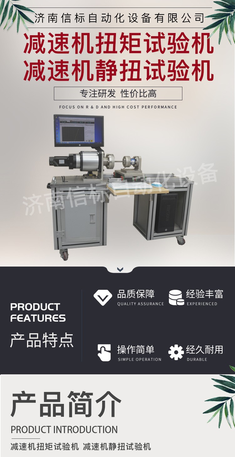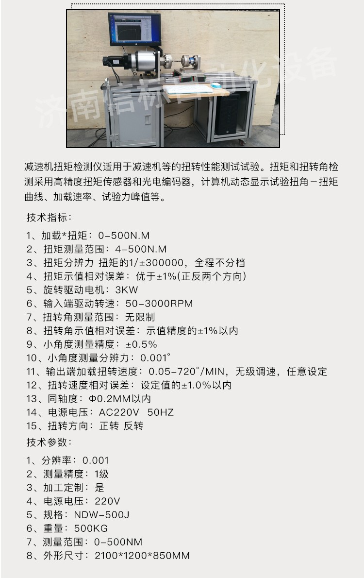 減速機(jī)扭矩試驗(yàn)機(jī) 減速機(jī)靜扭試驗(yàn)機(jī)產(chǎn)品特點(diǎn): 1、主機(jī):采用臥式結(jié)構(gòu),主體結(jié)構(gòu)采用框架結(jié)構(gòu),以保證整機(jī)的剛性。主傳動(dòng)軸、夾具采用 鋼材,保證其使用壽命。試樣的安裝、拆卸方便、快捷。夾頭的移動(dòng)端采用精密重型導(dǎo)軌,使其能自由移動(dòng),將試件的軸向拉力減少到 小。 2、驅(qū)動(dòng)系統(tǒng):由進(jìn)口全數(shù)字交流伺服控制系統(tǒng)驅(qū)動(dòng),速度調(diào)節(jié)范圍寬,加載均勻、穩(wěn)定。 3、傳動(dòng)系統(tǒng):采用精密減速器傳動(dòng),保證傳動(dòng)的均勻、穩(wěn)定及傳動(dòng)精度。橫向空間0~600mm范圍內(nèi)任意手動(dòng)調(diào)節(jié)。 4、測(cè)量顯示系統(tǒng):該機(jī)采用光電編碼器采集試樣的扭轉(zhuǎn)角度,高精度扭矩傳感器采集試樣的扭矩,高精度旋轉(zhuǎn)編碼器測(cè)量試樣的扭轉(zhuǎn)變形。計(jì)算機(jī)屏幕顯示試樣的扭矩、扭轉(zhuǎn)角度、扭轉(zhuǎn)變形以及各類曲線等。 技術(shù)指標(biāo): 1. 加載*扭矩:0-500N.m 2. 扭矩測(cè)量范圍:4-500N.m 3. 扭矩分辨力 扭矩的1/±300000,全程不分檔 4. 扭矩示值相對(duì)誤差:優(yōu)于±1%(正反兩個(gè)方向) 5. 旋轉(zhuǎn)驅(qū)動(dòng)電機(jī):3kW 6. 輸入端驅(qū)動(dòng)轉(zhuǎn)速:50-3000rpm 7. 扭轉(zhuǎn)角測(cè)量范圍:無限制 8. 扭轉(zhuǎn)角示值相對(duì)誤差:示值精度的±1%以內(nèi) 9. 小角度測(cè)量精度:±0.5% 10.小角度測(cè)量分辨力:0.001° 11.輸出端加載扭轉(zhuǎn)速度:0.05-720°/min,無級(jí)調(diào)速,任意設(shè)定 12.扭轉(zhuǎn)速度相對(duì)誤差:設(shè)定值的±1.0%以內(nèi) 13.同軸度:Ф0.2mm以內(nèi) 14.電源電壓:AC220V 50Hz 15.扭轉(zhuǎn)方向:正轉(zhuǎn) 反轉(zhuǎn) 技術(shù)參數(shù): 1分辨率:0.001 2測(cè)量精度:1級(jí) 3加工定制:是 4電源電壓:220v 5規(guī)格:NDW-500J 6重量:500kg 7測(cè)量范圍:0-500nm 8外形尺寸:2100*1200*850mm