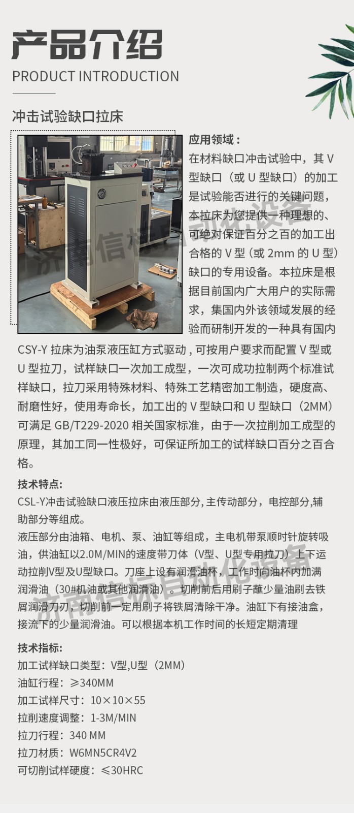 CSY-Y拉床為油泵液壓缸方式驅(qū)動(dòng),可按用戶要求而配置V 型或U 型拉刀,試樣缺口一次加工成型,一次可成功拉制兩個(gè)標(biāo)準(zhǔn)試樣缺口,拉刀采用特殊材料、特殊工藝精密加工制造,硬度高、耐磨性好,使用壽命長,加工出的V 型缺口和U 型缺口(2mm)可滿足GB/T229-2020相關(guān)國家標(biāo)準(zhǔn),由于一次拉削加工成型的原理,其加工同一性極好,可保證所加工的試樣缺口百分之百合格。 三、技術(shù)特點(diǎn): CSL-Y沖擊試驗(yàn)缺口液壓拉床由液壓部分, 主傳動(dòng)部分,電控部分,輔助部分等組成。 液壓部分由油箱、電機(jī)、泵、油缸等組成,主電機(jī)帶泵順時(shí)針旋轉(zhuǎn)吸油,供油缸以2.0m/min的速度帶刀體(V型、U型專用拉刀)上下運(yùn)動(dòng)拉削V型及U型缺口。刀座上設(shè)有潤滑油杯,工作時(shí)向油杯內(nèi)加滿潤滑油(30#機(jī)油或其他潤滑油)。切削前后用刷子蘸少量油刷去鐵屑潤滑刀刃,切削前一定用刷子將鐵屑清除干凈。油缸下有接油盒,接流下的少量潤滑油。可以根據(jù)本機(jī)工作時(shí)間的長短定期清理 四、技術(shù)指標(biāo): 加工試樣缺口類型:V型,U型(2mm) 油缸行程:≥340mm 加工試樣尺寸:10×10×55 拉削速度調(diào)整:1-3m/min 拉刀行程:340 mm 拉刀材質(zhì):W6Mn5Cr4V2 可切削試樣硬度:≤30HRC 五、設(shè)備配置: 缺口自動(dòng)拉床主機(jī) 1臺(tái) 拉刀及導(dǎo)向裝置 1套 試樣固定裝置 2套 油缸及連接部件 1套 潤滑噴淋系統(tǒng) 1套 10MPa油源動(dòng)力系統(tǒng) 1套 電氣及控制系統(tǒng) 1套 防護(hù)系統(tǒng)(帶開門斷電) 1套 產(chǎn)品合格證 1套 產(chǎn)品使用說明書 1套 產(chǎn)品使用說明書 1套 液壓系統(tǒng)配件 1套