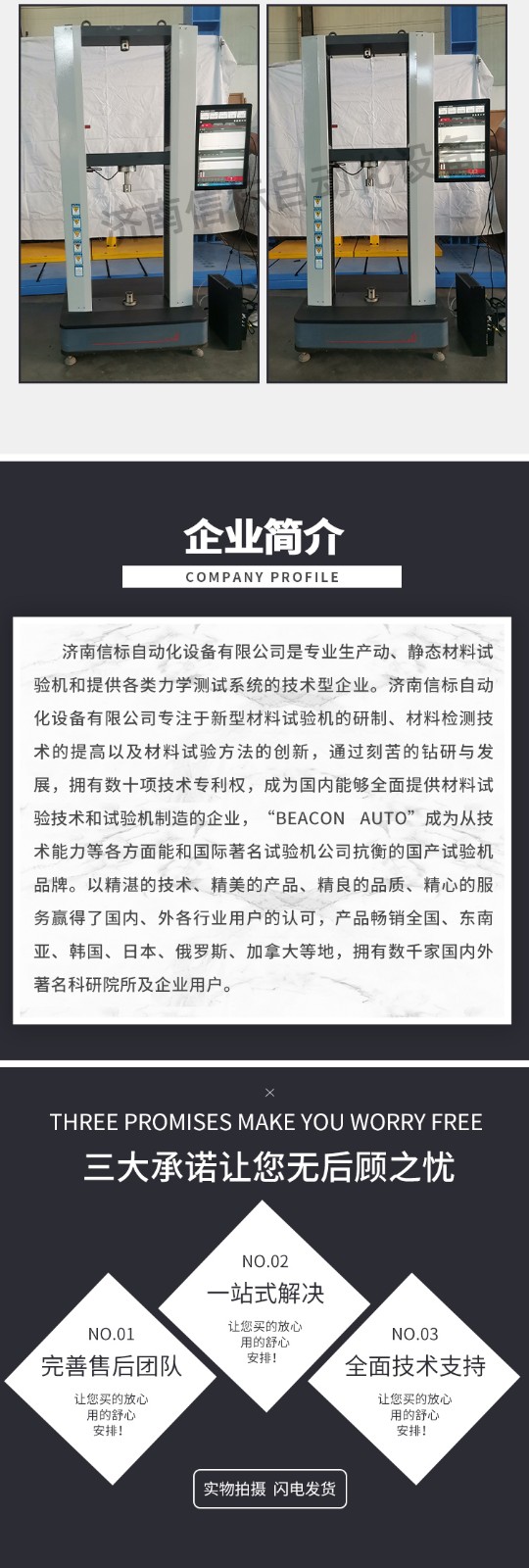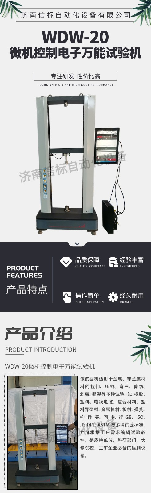 WDW-20微機控制電子萬能試驗機材料抗拉強度拉伸測試儀器測量參數: 1. 最大試驗力: 10/20/30/50kN 2. 試驗力測量范圍: 0.4%--100%。 3. 試驗力示值精度:優(yōu)于示值±1% 4. 試驗力分辨力:1/500000 5. 橫梁位移測量精度:分辨率高于0.0025mm 6. 變形測量精度: ±0.5% 7. 試驗速度范圍:0.0002—500mm/min,無級調速 8. 速度控制精度:±1%(0.0002~50mm/min); ±0.5%(50~3500mm/min) 9. 恒力、恒變形、恒位移控制范圍: 0.2%-100%FS 10.恒力、恒變形、恒位移控制精度: 設定值<10%FS時,設定值的±1.0%以內 設定值≥10%FS時,設定值的±0.1%以內 11. 變形速率控制精度: 速率<0.05%FS時為±2.0%設定值內 速率≥0.05%FS時為±0.5%設定值內 12. 試驗空間: A.拉伸空間:1000mm B.壓縮空間:1100mm C.寬度:450mm 13.下工作臺:450*250 14. 壓盤尺寸:φ100 mm 15. 整機電源:單相,220V±10%,50Hz,功率:750 W 16. 工作環(huán)境:室溫—35℃,相對濕度不超過80% 17. 主機尺寸: 870×730×1750mm 18. WDW-20微機控制電子萬能試驗機材料抗拉強度拉伸測試儀器重量:400 kg WDW-20微機控制電子萬能試驗機材料抗拉強度拉伸測試儀器產品配置: 1、主機 一套 2、松下A7全數字伺服電機及伺服驅動器; 一套 3、高精度負荷傳感器; 5kn/1kn/500N/200/ 各一支 4、Hiwin精密滾珠絲杠; 2支 5、光電編碼器(2500線,內置); 1支 6、夾具:滿足海綿/汽車座椅所需工裝 1套(有多種) 7、三閉環(huán)測量系統(tǒng)一套,采用力,位移,應變等多種控制方式,試驗過程中可實時顯示力-位移,力-時間,應力-應變等多種試驗曲線,并可自動得出最大負荷,拉伸強度,斷裂伸長率等多種結果參數。 8、HP品牌計算機,21寸液晶顯示器; 9、打印機:HPA4彩色噴墨打印機; 10、專用試驗軟件:可執(zhí)行GB,ISO,JIS、DIN,ASTM等多種試驗標準,全開放式,功能強大,方便操作,免費提供升級軟件,并可根據用戶需求自行編輯試驗軟件。