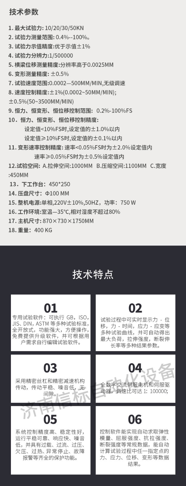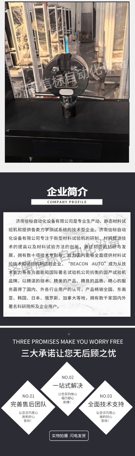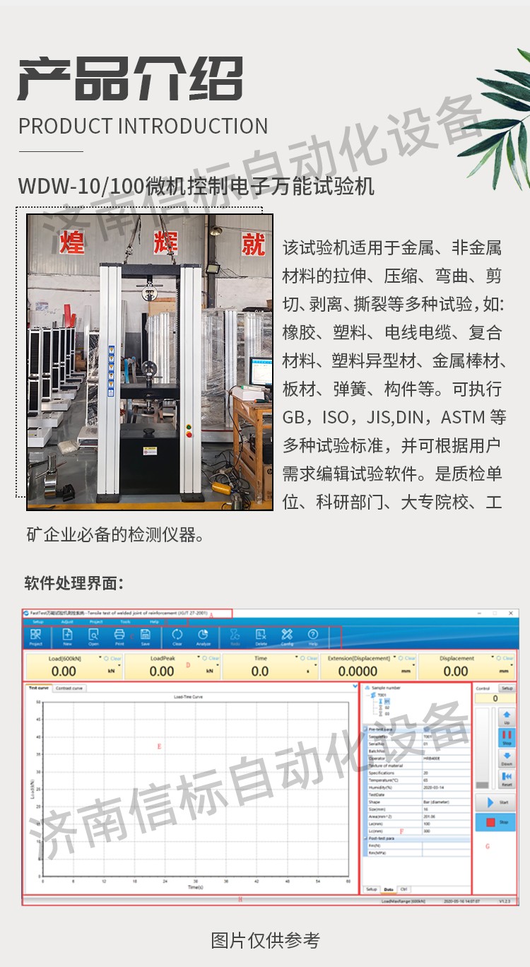 該試驗(yàn)機(jī)適用于金屬、非金屬材料的拉伸、壓縮、彎曲、剪切、剝離、撕裂等多種試驗(yàn),如:橡膠、塑料、電線電纜、復(fù)合材料、塑料異型材、金屬棒材、板材、彈簧、構(gòu)件等??蓤?zhí)行GB,ISO,JIS,DIN,ASTM等多種試驗(yàn)標(biāo)準(zhǔn),并可根據(jù)用戶需求編輯試驗(yàn)軟件。是質(zhì)檢單位、科研部門(mén)、大專(zhuān)院校、工礦企業(yè)必備的檢測(cè)儀器。 二、測(cè)量參數(shù): 1. 最大試驗(yàn)力: 10/20/30/50kN 2. 試驗(yàn)力測(cè)量范圍: 0.4%--100%。 3. 試驗(yàn)力示值精度:優(yōu)于示值±1% 4. 試驗(yàn)力分辨力:1/500000 5. 橫梁位移測(cè)量精度:分辨率高于0.0025mm 6. 變形測(cè)量精度: ±0.5% 7. 試驗(yàn)速度范圍:0.0002—500mm/min,無(wú)級(jí)調(diào)速 8. 速度控制精度:±1%(0.0002~50mm/min); ±0.5%(50~3500mm/min) 9. 恒力、恒變形、恒位移控制范圍: 0.2%-100%FS 10.恒力、恒變形、恒位移控制精度: 設(shè)定值<10%FS時(shí),設(shè)定值的±1.0%以內(nèi) 設(shè)定值≥10%FS時(shí),設(shè)定值的±0.1%以內(nèi) 11. 變形速率控制精度: 速率<0.05%FS時(shí)為±2.0%設(shè)定值內(nèi) 速率≥0.05%FS時(shí)為±0.5%設(shè)定值內(nèi) 12.試驗(yàn)空間: A.拉伸空間:1000mm B.壓縮空間:1100mm C.寬度:450mm 13.下工作臺(tái):450*250 14. 壓盤(pán)尺寸:φ100 mm 15. 整機(jī)電源:單相,220V±10%,50Hz,功率:750 W 16. 工作環(huán)境:室溫—35℃,相對(duì)濕度不超過(guò)80% 17. 主機(jī)尺寸: 870×730×1750mm 18. 重量:400 kg 三、產(chǎn)品配置: 1、主機(jī) 一套 2、松下A7全數(shù)字伺服電機(jī)及伺服驅(qū)動(dòng)器; 一套 3、高精度負(fù)荷傳感器; 5kn/1kn/500N/200/ 各一支 4、Hiwin精密滾珠絲杠; 2支 5、光電編碼器(2500線,內(nèi)置); 1支 6、夾具:滿足海綿/汽車(chē)座椅所需工裝 1套(有多種)
