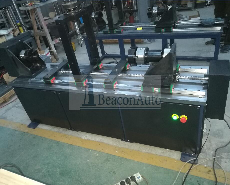 貫流風(fēng)葉旋轉(zhuǎn)試驗臺主要技術(shù)指標(biāo) 試驗及級別:1級 最大拉伸試驗力: 10000N 最大試驗扭矩: 50 Nm 最大徑向試驗力: 500N 位移最小讀數(shù):0.01mm 位移最大讀數(shù):600.00mm 角位移最大讀數(shù):999.99度 角位移最小讀數(shù):0.1度 最大行程:1200mm 電源:220V 50Hz 扭轉(zhuǎn)部分: 1.貫流風(fēng)葉旋轉(zhuǎn)試驗臺項目簡介 扭轉(zhuǎn)部分是由加載系統(tǒng)、傳動系統(tǒng)、數(shù)字式數(shù)據(jù)采集處理系統(tǒng)及計算機(jī)測量控制顯示系統(tǒng)等組成,適用于對軸流風(fēng)扇靜態(tài)扭轉(zhuǎn)力學(xué)的性能測試。該機(jī)采用落地臥式結(jié)構(gòu)。計算機(jī)屏幕顯示,數(shù)字式數(shù)據(jù)采集控制系統(tǒng)和全數(shù)字交流伺服系統(tǒng)組成閉環(huán)控制。采用行星擺線針輪減速器傳動,具有加載均勻、穩(wěn)定、無沖擊現(xiàn)象、數(shù)據(jù)采集控制準(zhǔn)確的特點。 試驗測試功能:Win2000/XP中文操作平臺。使用以圖形為界面的視窗式操作系統(tǒng),可設(shè)定顯示屏幕及操作面板;可設(shè)定試驗速度及各種控制參數(shù);可實時顯示基本試驗結(jié)果(斷裂值、峰值);可實時顯示試驗過程各種相關(guān)參數(shù)圖形;可實現(xiàn)系統(tǒng)診斷并顯示診斷結(jié)果。試驗機(jī)實現(xiàn)分級管理權(quán)限。不同的用戶可進(jìn)入不同的管理界面、分三級用戶管理權(quán)限。 整機(jī)利用全數(shù)字交流伺服控制系統(tǒng)及數(shù)字式數(shù)據(jù)采集處理系統(tǒng),光電編碼器采集試樣的扭轉(zhuǎn)角度。 2.目的: 軸流風(fēng)扇的靜態(tài)扭轉(zhuǎn)實驗 3.方案描述 【主 機(jī)】采用臥式結(jié)構(gòu),主體結(jié)構(gòu)采用焊接結(jié)構(gòu),以保證整機(jī)的剛性。夾具采用優(yōu)質(zhì)合金結(jié)構(gòu)鋼40CrNiMoA淬火(HRC45~50)方式,主傳動軸采用優(yōu)質(zhì)合金結(jié)構(gòu)鋼淬火處理,保證其使用壽命。試樣的安裝、拆卸方便、快捷。 【驅(qū)動系統(tǒng)】由全數(shù)字交流伺服控制系統(tǒng)驅(qū)動。速度調(diào)節(jié)范圍寬,加載均勻、穩(wěn)定。 【傳動系統(tǒng)】采用行星擺線針輪減速器傳動,保證傳動的均勻、穩(wěn)定及傳動精度??v向空間可以根據(jù)汽車半軸的規(guī)格進(jìn)行調(diào)整,橫向空間根據(jù)驅(qū)動橋的規(guī)格任意手動調(diào)節(jié)。 【測量顯示系統(tǒng)】該機(jī)采用光電編碼器采集試樣的扭轉(zhuǎn)角度,高精度扭矩傳感器采集試樣的扭矩。計算機(jī)屏幕顯示試樣的扭矩、扭轉(zhuǎn)角度、扭轉(zhuǎn)剛度以及各類曲線等。 【軟件操作】 ★控制模式采用智能專家設(shè)置系統(tǒng),用戶可以根據(jù)自己的實際要求編制試驗過程控制方式,自動完成試驗。 ★ Windows2000/XP全中文界面,人機(jī)對話方式。試驗的全部操作均借助CRT,通過計算機(jī)鍵盤與鼠標(biāo)完成,計算機(jī)屏幕顯示試驗扭矩T,扭轉(zhuǎn)角度θ,扭轉(zhuǎn)次數(shù),各種試驗曲線(扭矩-時間曲線、扭矩-角度曲線、角度-時間曲線等)試驗機(jī)工作狀態(tài)等。 ★曲線坐標(biāo)的大小可以根據(jù)實際的試驗數(shù)據(jù)進(jìn)行調(diào)整。 ★輸出打印各種試驗報表格式(報表格式可以Excel或Word格式輸出)。 ★符合JB/T9370—1999《扭轉(zhuǎn)試驗機(jī)技術(shù)條件》及GB10128—88《金屬室溫扭轉(zhuǎn)試驗方法》數(shù)據(jù)處理的相關(guān)要求。 ★可以設(shè)定以正弦波或方波的方式進(jìn)行循環(huán)加載。 ★ 試驗過程可以實現(xiàn)模擬再現(xiàn)。 ★ 可以任意多條試驗曲線疊加對比、輸出打印。 ★ 可以進(jìn)行數(shù)字化調(diào)零和標(biāo)定。 ★ 試驗數(shù)據(jù)采用數(shù)據(jù)庫管理方式,便于查詢和維護(hù)。 ★ 軟件系統(tǒng)的操作可以實現(xiàn)三級用戶管理,安全、方便、快捷。 【安全保護(hù)系統(tǒng)】過載保護(hù)、過電流、過電壓保護(hù)、超速保護(hù)、工作值保護(hù)、行進(jìn)保護(hù)等。 4.貫流風(fēng)葉旋轉(zhuǎn)試驗臺主要技術(shù)性能指標(biāo): 4. 1大輸出扭矩:±50Nm;測量范圍:±0.1~±50Nm 4. 2驗扭矩示值相對誤差:±1% 4.3試驗扭矩重復(fù)性相對示值誤差:≤1% 4.4扭矩測量范圍:1%~100% 4.5縱向空間:0~1200mm可調(diào) 4. 6轉(zhuǎn)角度分辯率:0.10; 4. 7加載方式:可以設(shè)定以一定速度或扭距進(jìn)行持續(xù)加載。 4. 8加載速度:0.005~3r/min任意設(shè)定 4. 9加載控制精度為:±2% 4. 10壓電壓:AC380V 50Hz 5.貫流風(fēng)葉旋轉(zhuǎn)試驗臺功能要求: 5.1系統(tǒng)集成、加載、操作運(yùn)行控制由計算機(jī)控制,試驗過程的數(shù)據(jù)采集、記錄由計算機(jī)完成,可以實現(xiàn)試驗數(shù)據(jù)回放,報表輸出; 5.2加載量在設(shè)備性能指標(biāo)的范圍內(nèi)連續(xù)可調(diào)穩(wěn)定輸出; 5.3試驗控制操作集中在控制臺(柜),采用單人坐式操作;試驗件安裝調(diào)整符合操作人員立式操作的要求;試驗工裝需要必要的旋轉(zhuǎn)功能,方便主減齒輪試驗時主減速器的安裝、拆卸; 二軸向及徑向加載部分 1.1全數(shù)字交流伺服電機(jī)和伺服驅(qū)動器,調(diào)速比可達(dá)1:30;該系統(tǒng)控制精度高、穩(wěn)定性好,運(yùn)行平穩(wěn)可靠、響應(yīng)快、噪音低,并具有過載、過流、過壓、欠壓、過熱、 異常停止、故障報警等齊全的保護(hù)功能,
